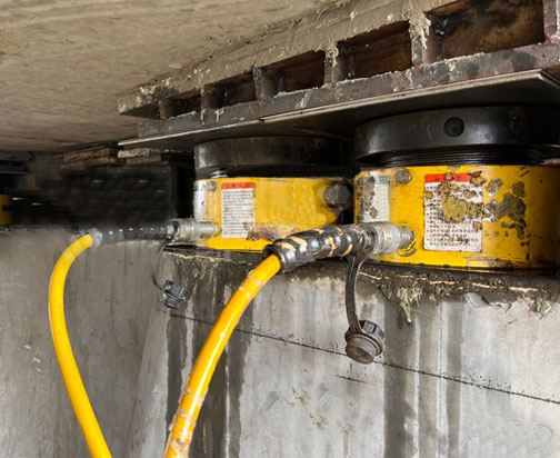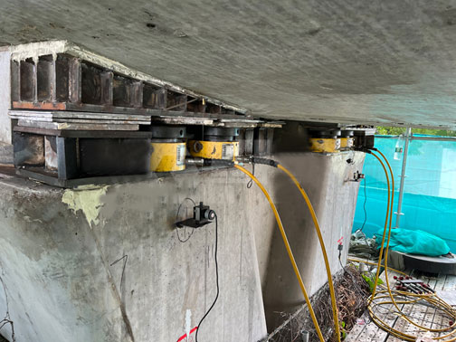 高架匝道同步頂升更換支座,選用32臺(tái) 200T-50mm薄型自鎖液壓千斤頂,配套兩套PLC 8點(diǎn)智能控制同步頂升液壓系統(tǒng)使用,同步精度±0.5mm,此次施工主要采用在立柱上架設(shè)千斤頂整體頂升匝道的方式。頂升完成后,將對(duì)損壞的橡膠支座進(jìn)行維修,并對(duì)支座相關(guān)配套設(shè)施進(jìn)行保養(yǎng)。待維修保養(yǎng)完成后,放下千斤頂,匝道復(fù)位,整體頂升效果良好!